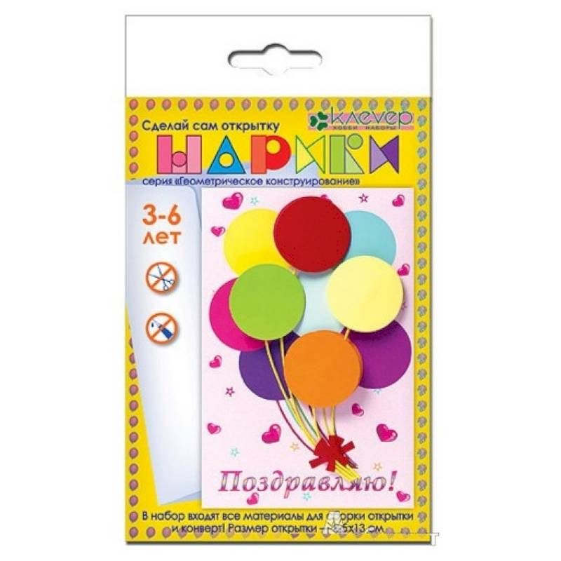 Комплектация: комплект геометрических фигур из цветной бумаги, открытка из картона, х/б нити, объемный скотч, инструкция, конверт.