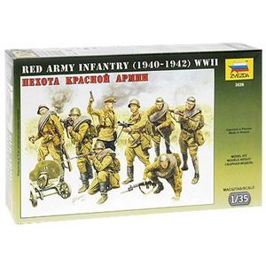 Набор из 7 фигурок рядовых и фигурки командира Красной Армии в момент атаки, бойцы одеты в полевую форму на начальный период Великой Отечественной войны. Солдаты вооружены винтовками различных систем, ручным пулеметом системы Дягтерева и станковым пулеметом системы Максима.
