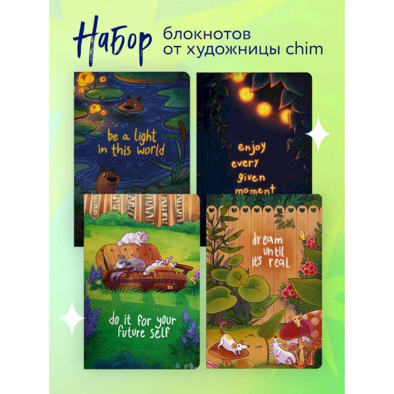В комплект вошли 4 блокнота с разными иллюстрациями на обложке — собачками, мышками, выдрами и вечерним садом. Выберите по настроению, в каком будете писать сегодня, или ведите сразу все для разных дел!
