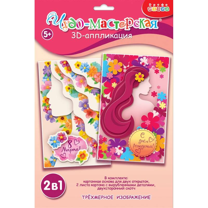 3D-аппликация - современный и очень увлекательный вид творчества. Малыш легко сделает самостоятельно объёмные 3D-открытки: детали аппликации уже вырублены, нужно только аккуратно выдавить их из основы и приклеить на картинку объёмным двухсторонним скотчем. Элементы аппликации наклеиваются в несколько слоёв, что придаёт плоскому изображению эффект объёма.