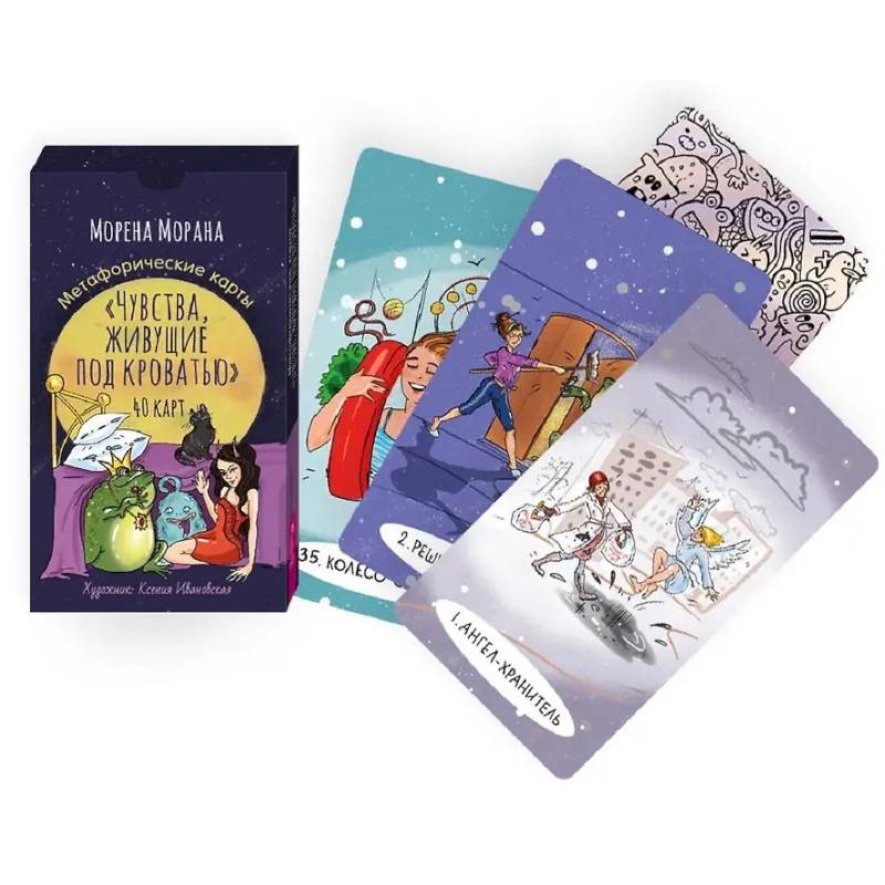 Колода состоит из 40 карт с авторскими иллюстрациями и короткими названиями, раскрывающими знакомые каждому эмоции и состояния: от страха и тревоги до любви и желания роста и свободы.